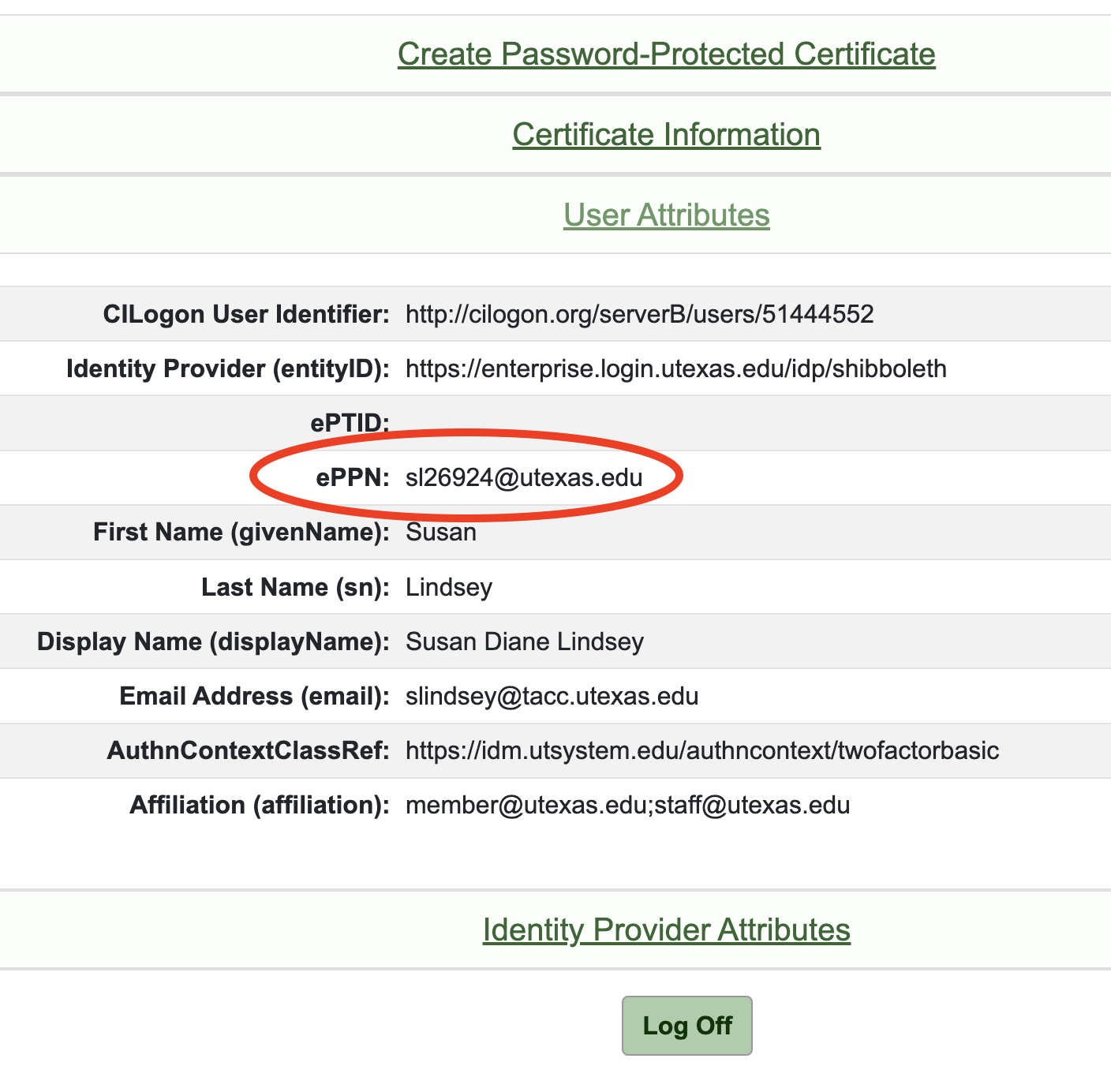 Login to CILogon and click on "User Attributes". Make note of your case-sensitive ePPN.